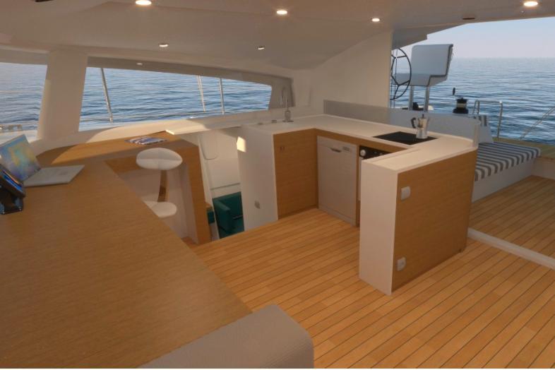 U-SHAPED PANORAMIC VIEW GALLEY (on starboard when entering) 1 stainless steel sink - 1 fresh water mixer tap (cold/hot water) - 1 sea water tap 1 dish rack 1 Corian counter top 1 storage space (dish-washer option) 1 garbage can under the counter 1 ENO recessed ceramic-glass cooktop, 3 burners