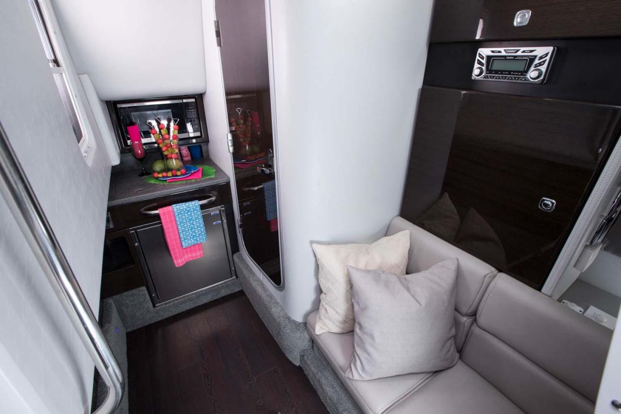 The Formula 350 is one of the few premium bowriders offering a true cabin with full amenities, allowing both day comfort and overnight stays. The air-conditioned interior is bright, modern, and well-finished with the brand’s signature craftsmanship.