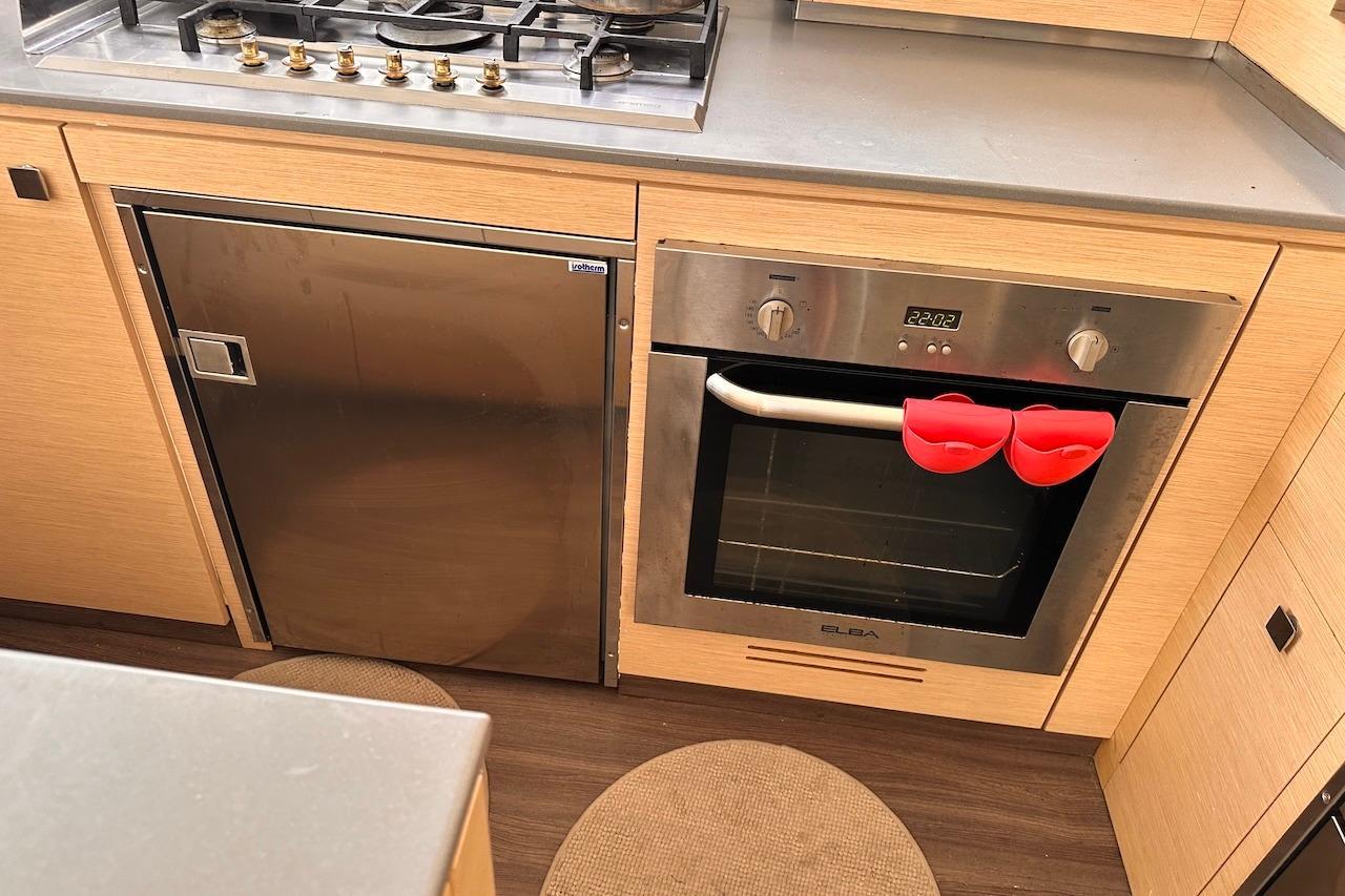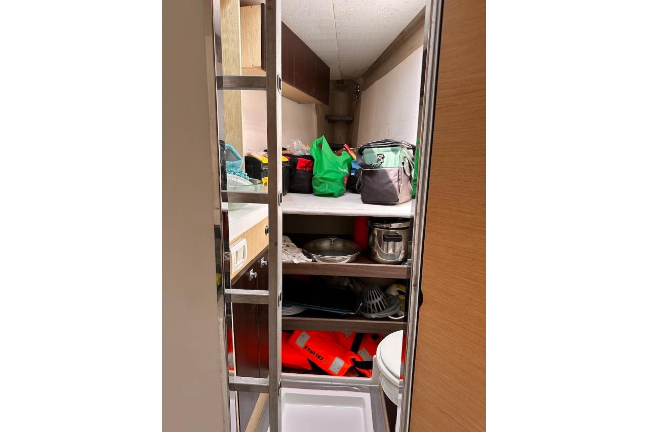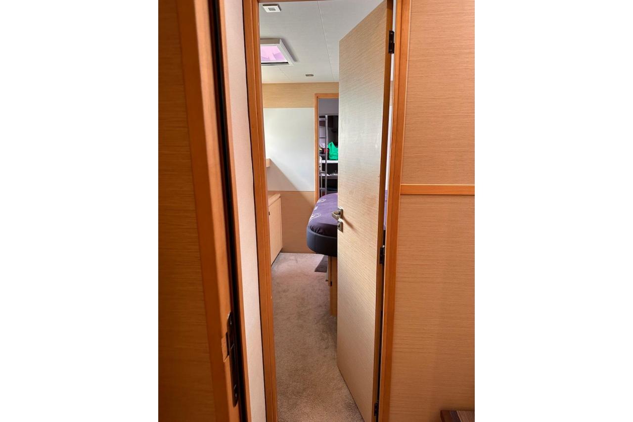 This boat differs slightly from the original factory specification and is now equipped with two Isotherm 24V drawer refrigerators and one Isotherm 24V freezer (no Bosch fridge or dishwasher). The cockpit features partial sun shades instead of a full enclosure, and the flybridge is open without a bimini.