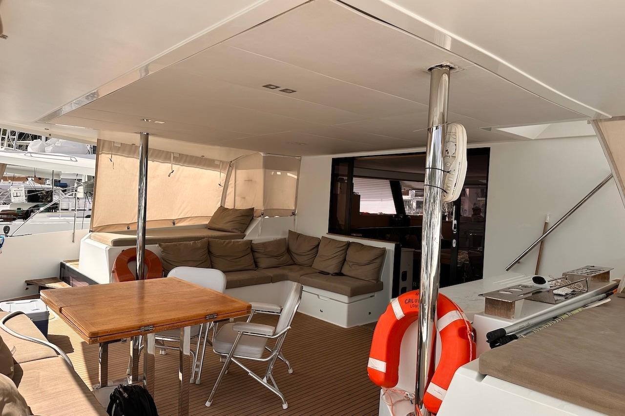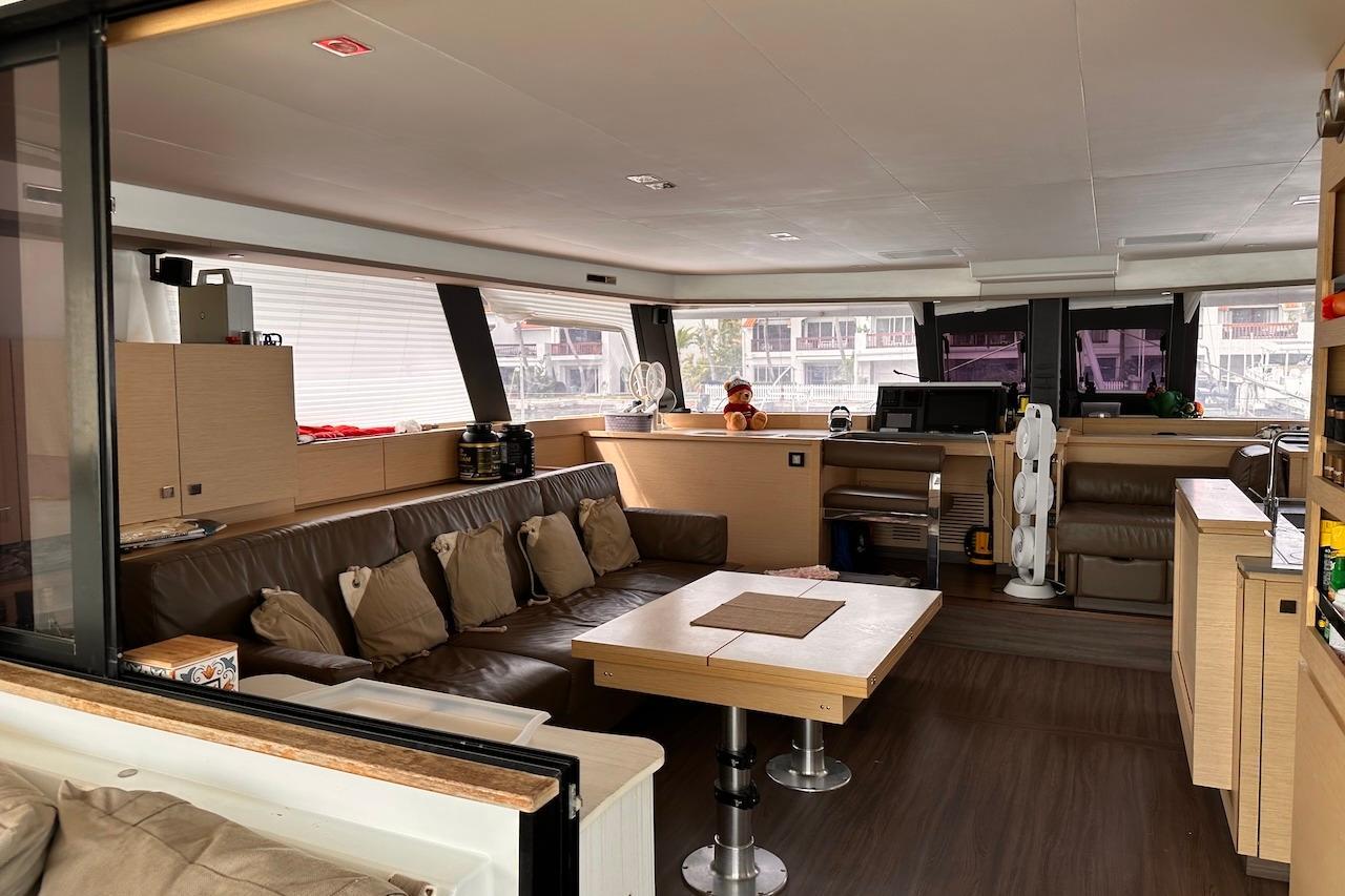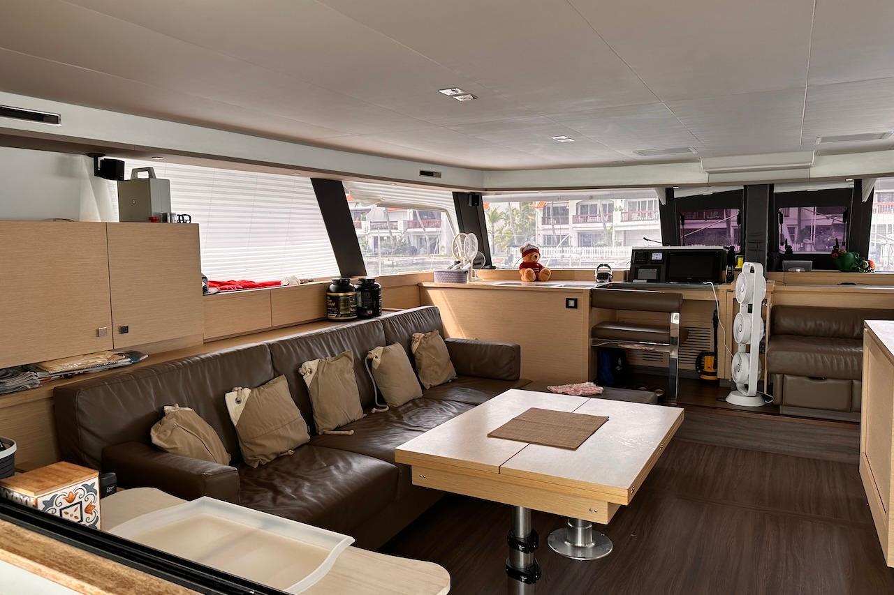 The bright panoramic saloon connects seamlessly to the large cockpit dining area, creating an ideal indoor/outdoor living space for cruising or entertaining.