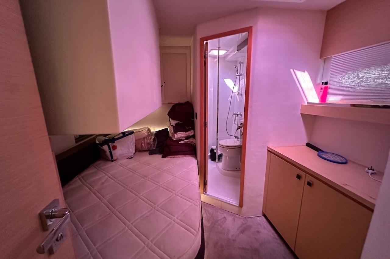 Starboard hull with three double guest cabins, each with en-suite bathrooms including shower and electric freshwater toilets.
